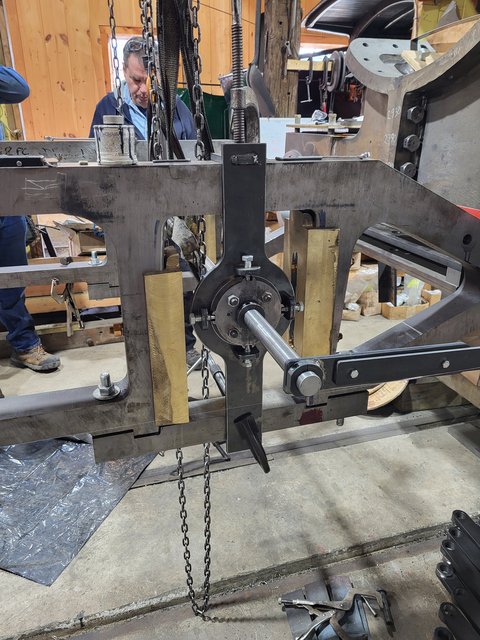 Rick Sisson, Joe Monty, Harold Downey and John Pierce pressed bushings into these holes which will receive pins when the entire forward suspension system is assembled. We used both the bench arbor press and....