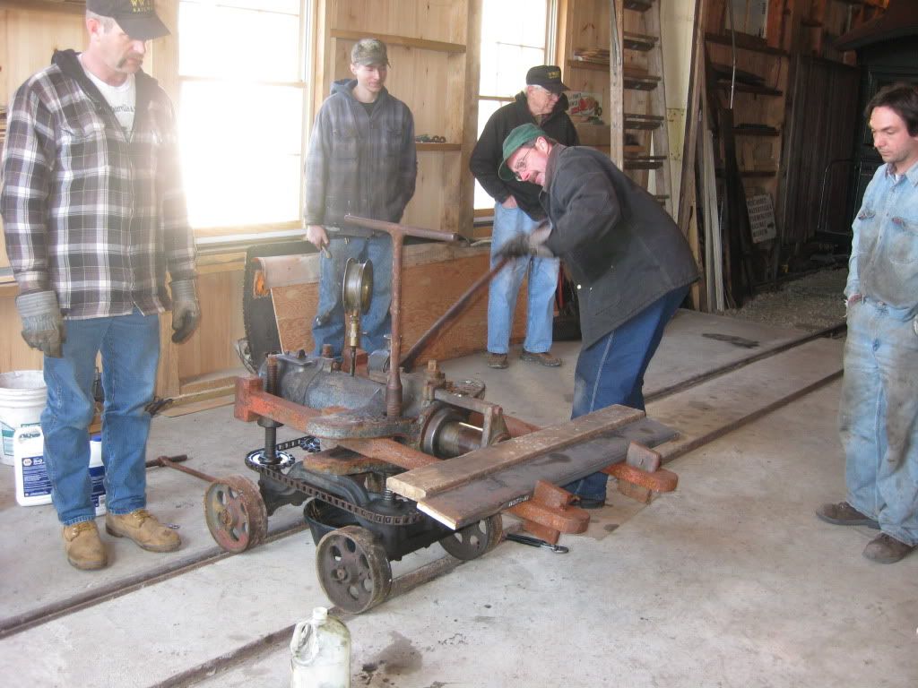 As James was not here this weekend, I'll try to tell you what we did.  There was work being done in the shop on #9 and on a steam Genator parts as well as trying to get an old hydrolic press working. A new brake shoe was put on the diesel as one wears out faster than the others. In the afternoon six of us went to the end of track and did more cleaning up. Also cut down some leaning trees. There's still some work to be done between Sheepscot and Alna Center. We picked up the two rails at the top of the grade on the right just North of Alna Center and the blocking under them. Hopfully when the new sidings are build everything along the railroad can be picked up and brought back to Sheepscot,and we will have a clean right of way all the way to the North end.