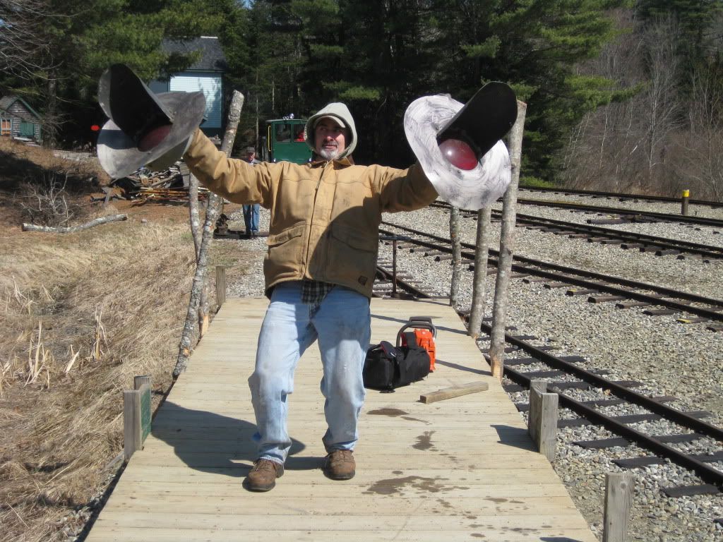 * I heard reports that Trask Crossing was messed up with dirt and rocks from tree clearing operations on his mother's land, so I took the engine up with JB along and cleaned up the crossing.  While there the fellows that were doing the work came in and we chatted for a few minutes.  Turns out one of the guys grew up in Coopers Mills next to the ROW, so he knew all about the railroad.  I invited him over for Easter Express.  A later trip past Trask revealed that they have really cleared out a lot of trees - but they've been very neat about it and haven't left a lot of slash behind.
