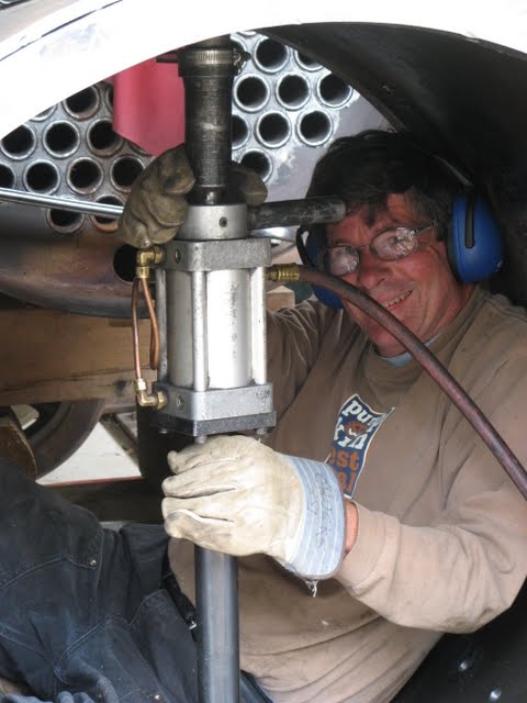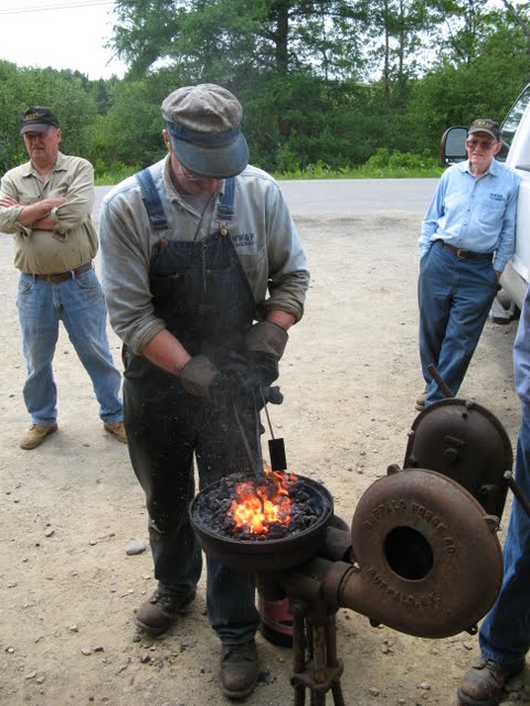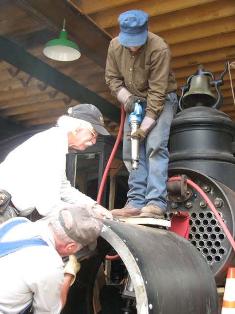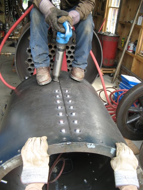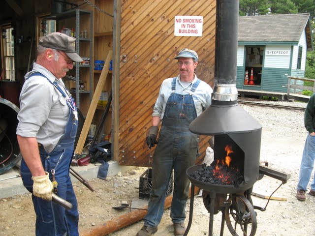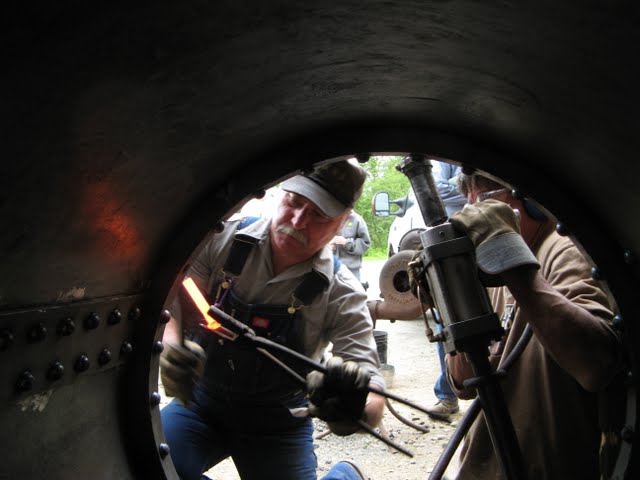 A couple of black smiths burn rivets for #9's smoke box over two coal forge's brought special for the day by one of the museum's regular volunteers.