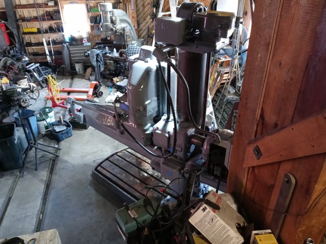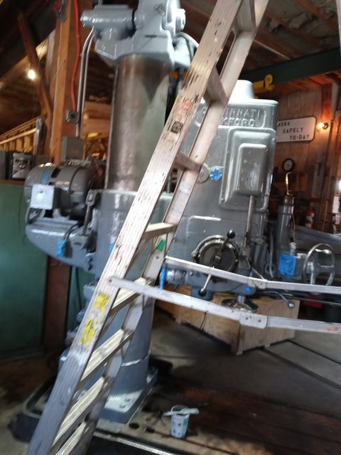The radial arm drill that we purchased in August needed it's column bearings replaced. Disassembly happened last fall, and it has been sitting outside the shop under tarps since then. This was a rather substantial undertaking for the size of the machine and the weight of the subassemblies being handled. Amusingly, the service manual never anticipated this level of repair, so we were "off book". I got the new bearings back in October and since the new year, Carlos and Jerry Stienke and myself have been reassembling the drill in stages as time has permitted. Yesterday marked the final day of major assembly work with the outer column going back on the base riding on the new bearings, and the arm being slid back onto the outer column. I was thrilled to find that once we removed our rigging, the drill head spins on the column like a top!