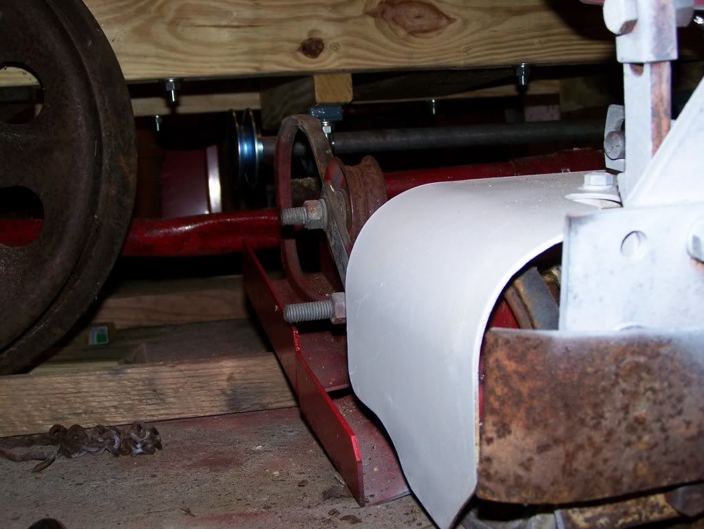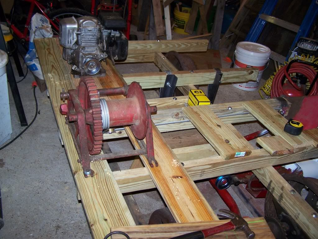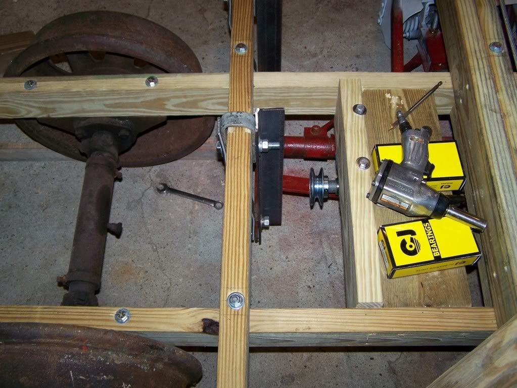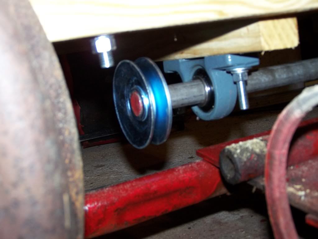 Another day I have had time to work on this. I modified my plan and am going to eliminate two bearings and a shaft. This will be accomplished by running the belt from the position of the motor in the picture below to the pulley and shaft I installed yesterday. I did a little decking to get things in proper alaignment.