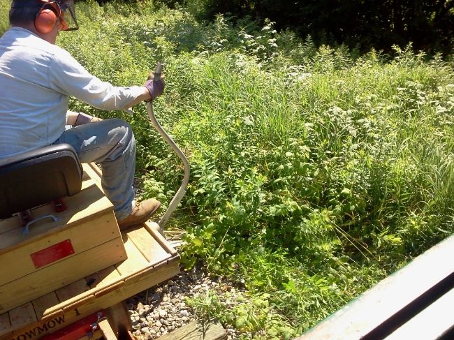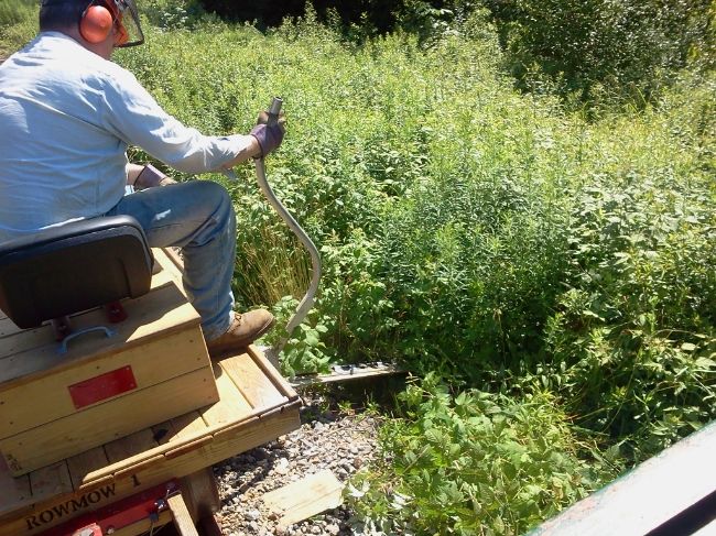Perhaps we can make a few more trips with the weed killer which will take care of the growth on the ballast and ties so the ROWMOW1 can be set for outboard of that point.  Bob and I noticed that an additional spray nozzle on each side of the arms pointed out at about a 45 to 60 degree angle would cover even more of the outboard growth.