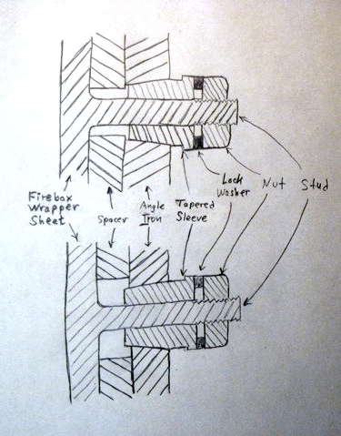 Mike, here is a hastily drawn sketch, photographed with my digital camera, showing two arrangements, one above, one below,  whereby the tapered sleeves would not prevent the nuts from drawing the angle iron tight to the spacer and firebox wrapper sheet. These are supposed to be sectional views formed by a vertical plane passing through the axis of a stud. I don't know whether No. 9 has either arrangement exactly, but it should be something similar. I did draw the tapered sleeves a little wrong. I don't believe they have any shoulder on the straight part of them.