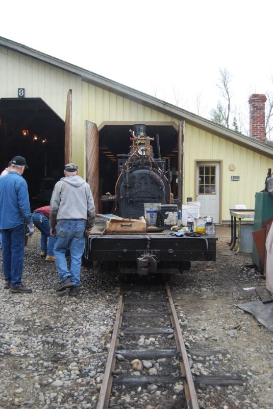 The photo shows Rick and Jason testing the vacuum brake master valve.  Even though it hasn't been used in over 80 years it worked perfectly!  Eric is seated on the deck as he applies graphite to the backhead.  He did the smokebox as well and both look great.