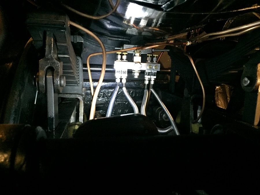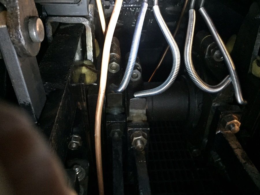 Oil line pictures. The valve block takes one feed from the oiler and splits out to four flexible lines to the eccentrics. Each driver bearing has it's own feed line off the oiler.