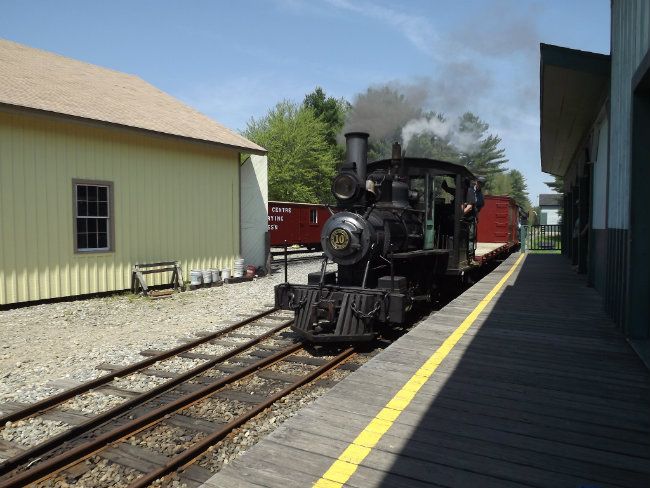Today was the NMRA (not NRHS) Charter.  There were about 80 members from various places including ME, NH, VT, MA, CT, NY, OH and PA.    The first train went out at 10:15 with 66 passengers.  The consist was coaches 8 and 3, box 309 and flat 118.  Engine 10 was on the point with Gordon running and Joe firing.  Note: Today is Gordon's birthday and we're glad he wanted to enjoy it with his narrow gauge friends.  Happy Birthday Gawdon!  The visitors who stayed at Sheepscot toured the shop and rode the railcar within the Yard Limit.  Milk car 65 was pushed outside for photos.  The exterior painting is now almost complete (need some touch-up) and the tin roof man stopped by to measure the car.