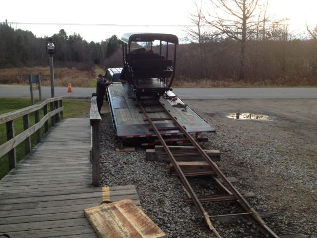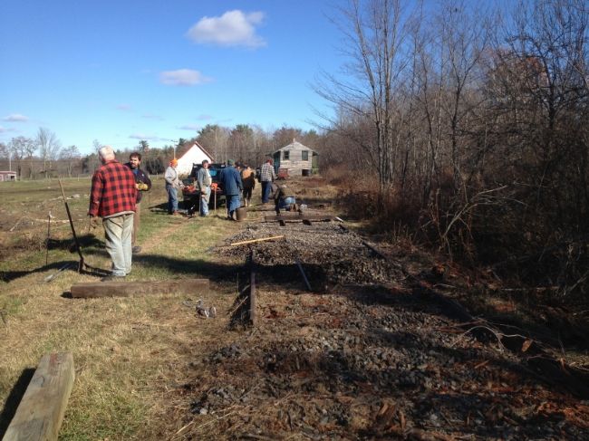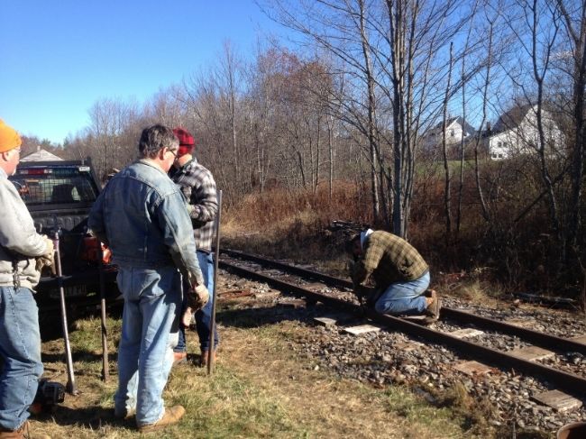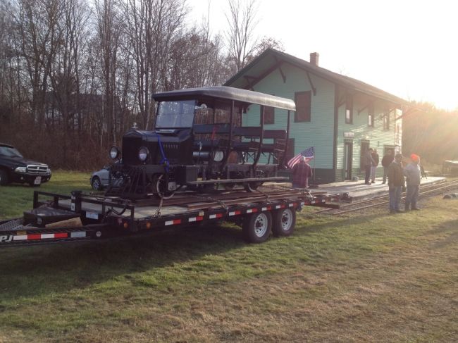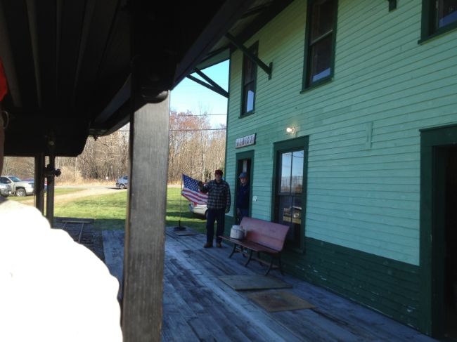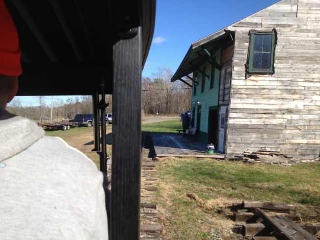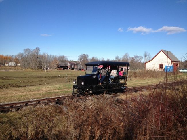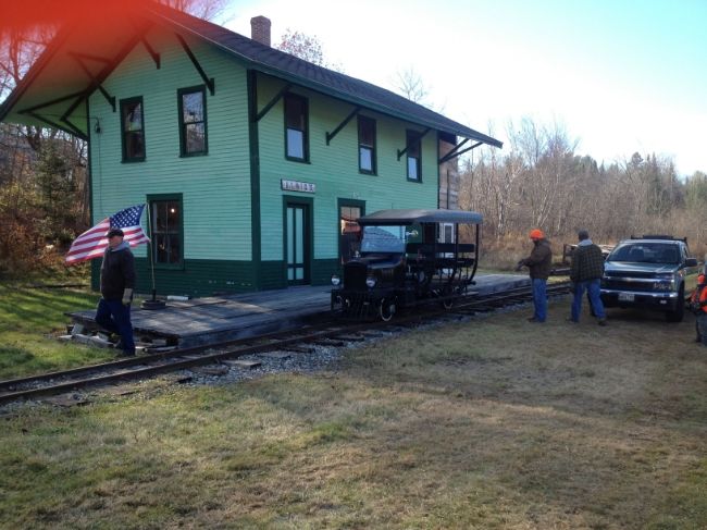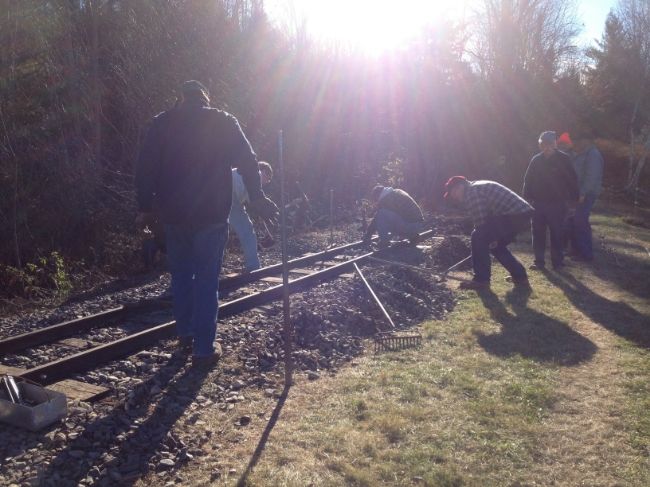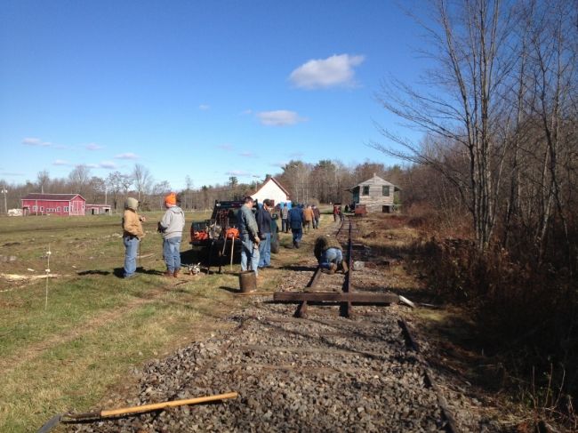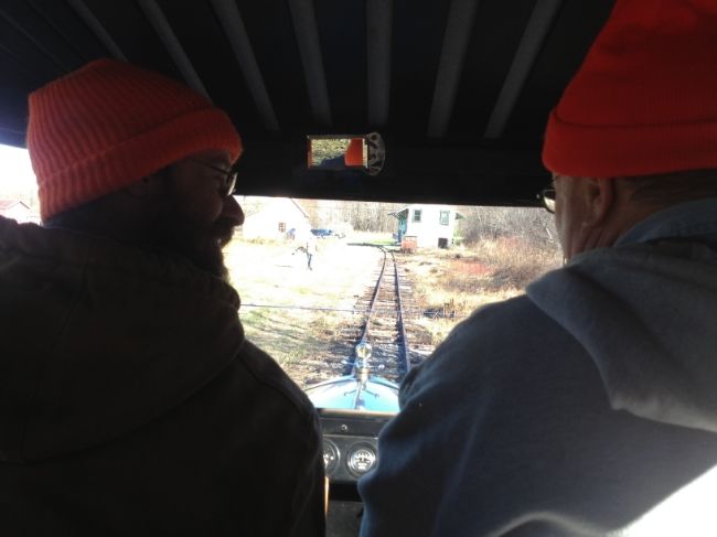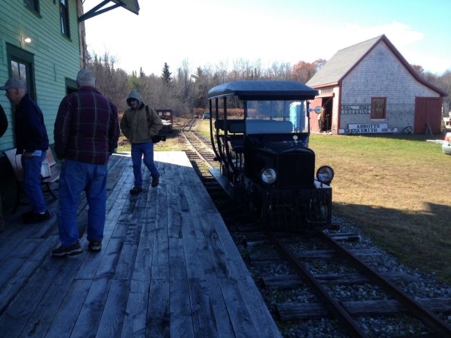 The railcar's visit was a big hit with quite a few local people (many bringing children) taking a ride to the end of track and back. The car was unloaded around 9:30 and James and Start devised an operating plan that gave passengers two trips of the line with each ticket. First, passengers were loaded at the station platform and taken to the south end of operable track. They returned and the second run started at the north end of the manline. It was some cool running past the station going south! The railcar operated facing north in the morning and was turned to face south after lunch. Oh, and by the way, a nice lunch was provided by the Albion Historical Society, served in the depot waiting room which had a warm wood stove. The railcar also did some work, bringing the track crew in for lunch and delivering supplies to the south end. The rails had a nice shine with all the action.
