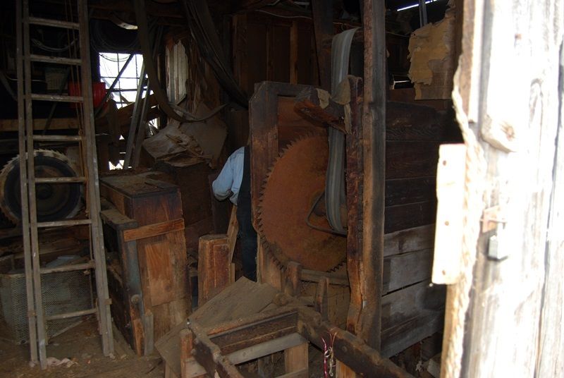 This is the cut off saw. Logs came in on wooden rollers that we saved on the frame going through the door on the right. The log would be pushed up to the post on the left and a bolt sawed off for the shingle mill. The cut off saw just hangs and pivots off the line shaft. The wood box to the left behind the ladder is the edger used to make the shingles square.