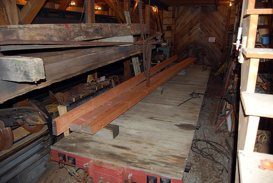 Timbers for the new side sills arrived last weekend. The third smaller timber standing on it's side will be ripped down for the roof purlins. The oak logs we harvested are going to the sawmill this week to be turned into end beams, queenpost beams, and carbody framing. Car siding has also been ordered.