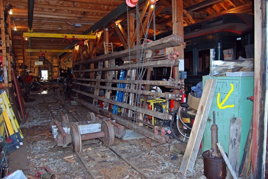 In the lower right hand corner under the yellow arrow is an original vacuum brake cylinder off of a Bridgton and Saco River box car.