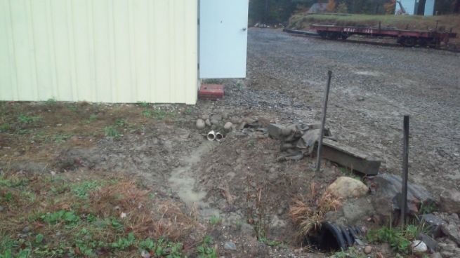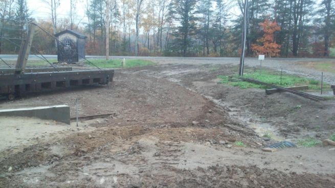 * Return of the Kubota - Mike and Joe brought the Kubota excavator back from its long summer at the Top of the Mountain.  It was unloaded from the flatcar then immediately put to use ditching along the side of the car barn (see pictures above) and smoothing out the area between the building and the run-through track.