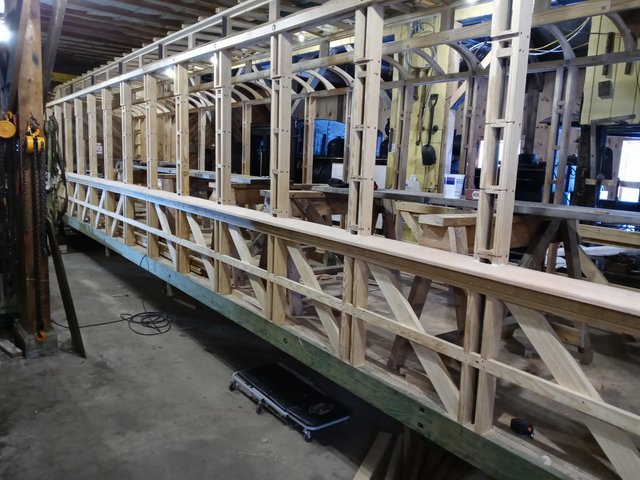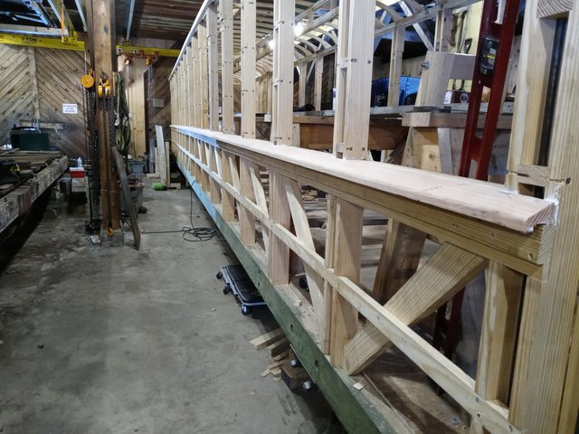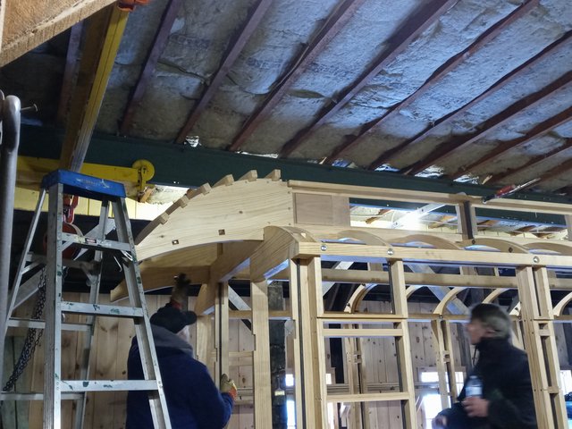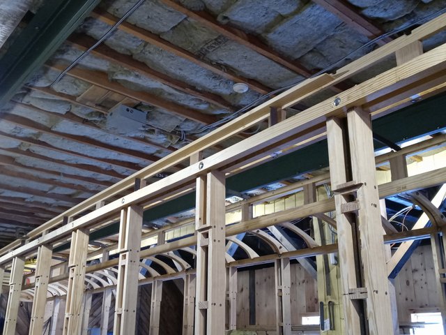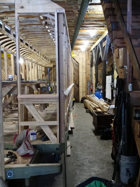 The clerestory roof frames look very close to the bay ceiling. Are you going to be able to finish the roof planking in the Engine House? I assume it will be stored in the Car Barn, when not in use?