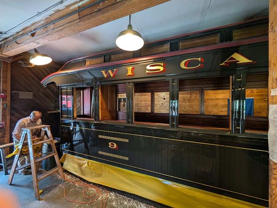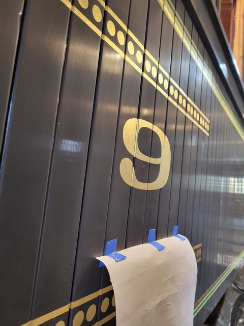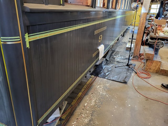 On 6/6/2025 Tom completed all the striping and lettering on Coach 9. Tomorrow, he gives us THE BILL. We know it will be over his initial estimate, but the work he did is outstanding and deserves every penny he will receive.