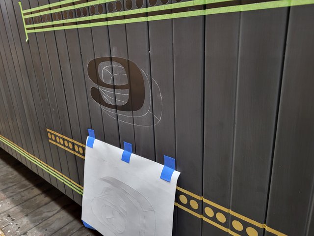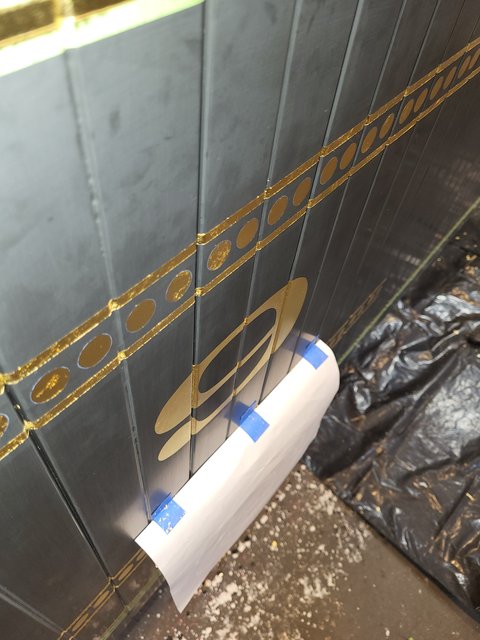 The gold letters have been painted. The sheets will be taped back up and the shadow lines chalked in.