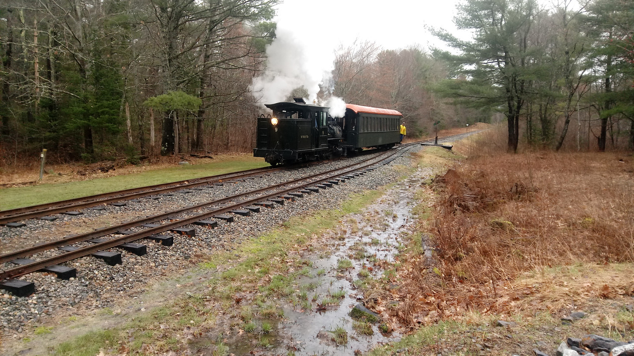 A damp morning to start (it rained heavily overnight). Looking from the Sheepscot platform, we see two steamers out on the main: No. 9 by the water tank and No. 3 by the north yard switch.