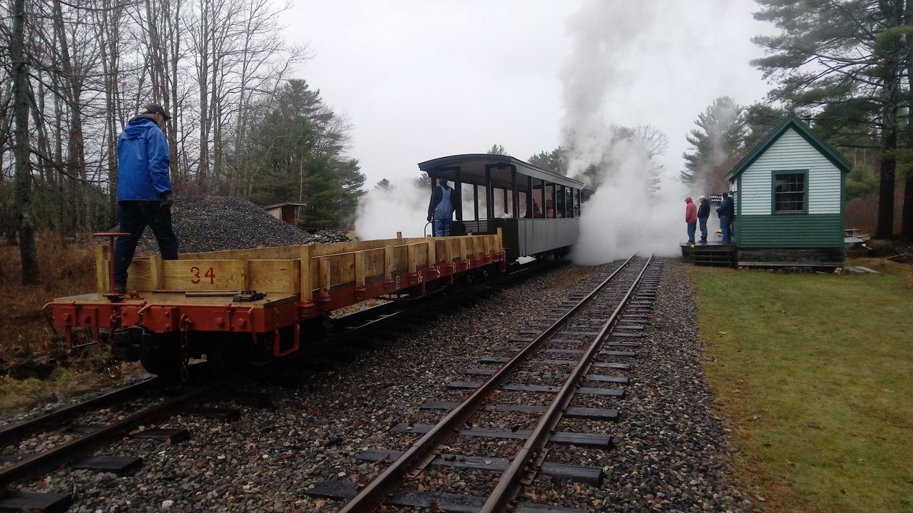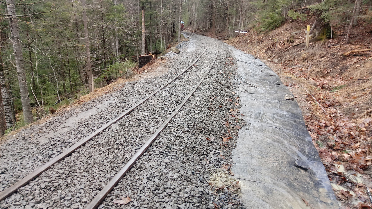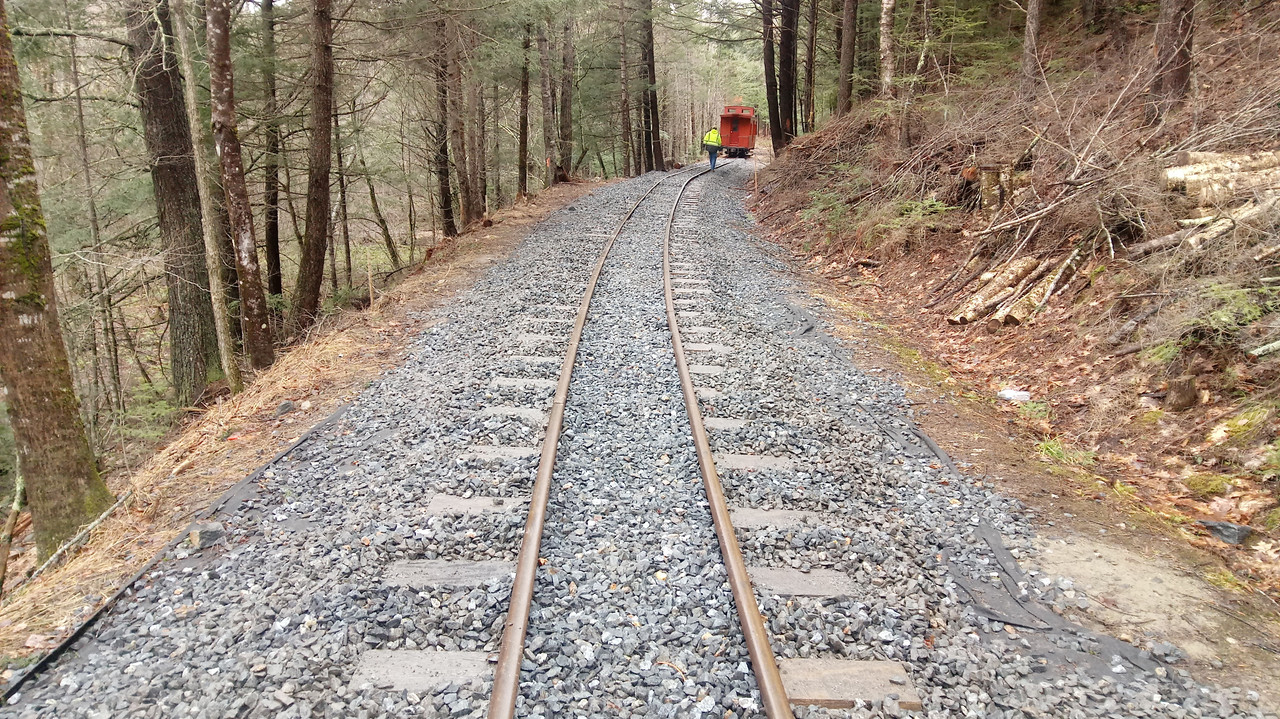 Meanwhile, stone trains dropped ballast south of the tamping crew. Locomotive no. 52's engineer Jonathan St. Mary talks with Joe Fox just north of the slide area.