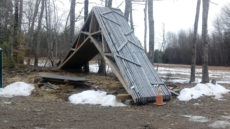 The other was the target on the south switch at Alna Center. I had measured the distance from the rail to the stand, but did not figure in the size of the target. We were able to creep up to it and Brendan threw the switch just enough to twist the target as the end to the trusses passed. Unloading was interesting, and Brendan lugged the trusses over and leaned them against a tree as I unloaded them with the crane.
