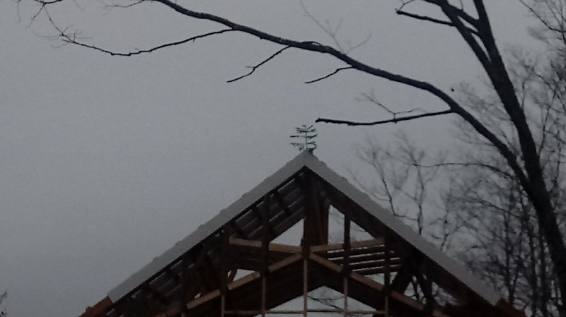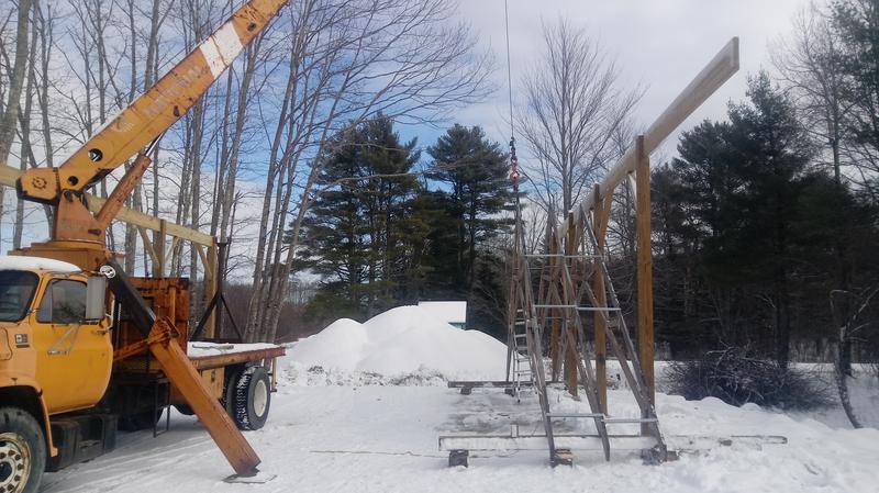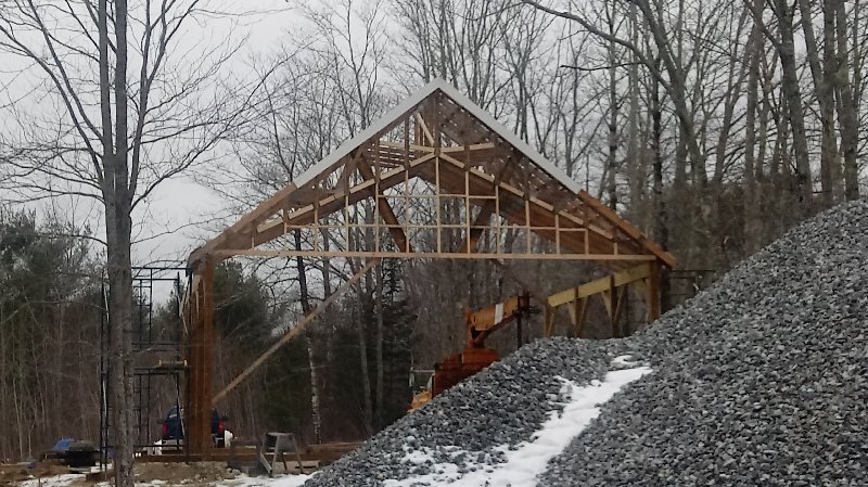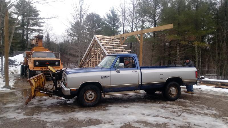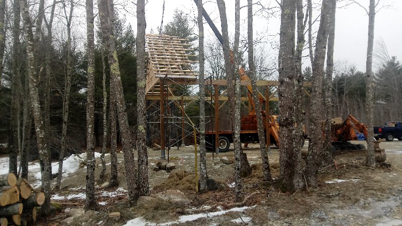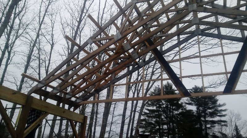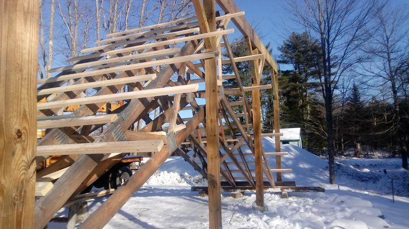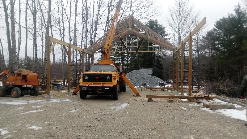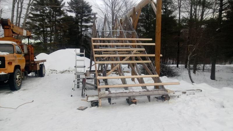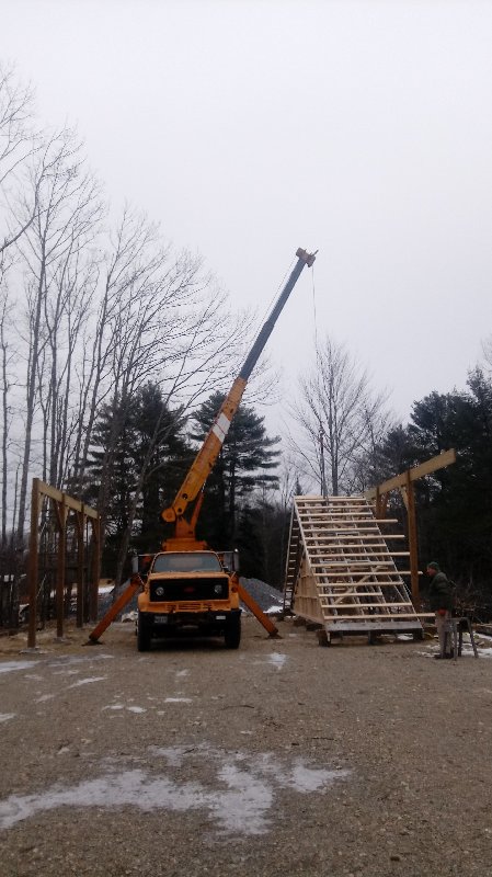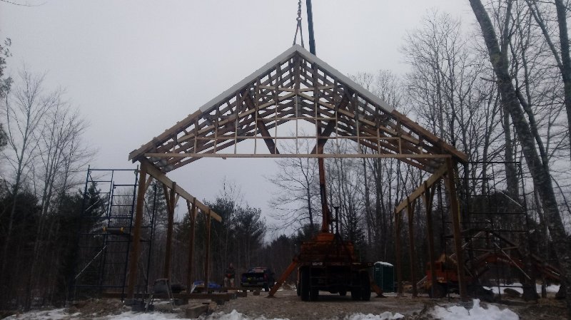What a beautiful day for January. We had lots of help this morning, and finished most of the truss work including the wall on the gable before lunch. Fred and HWMNBM brought up some staging and set it up. After lunch, the wind picked up. I decided that the setting of the truss would wait.