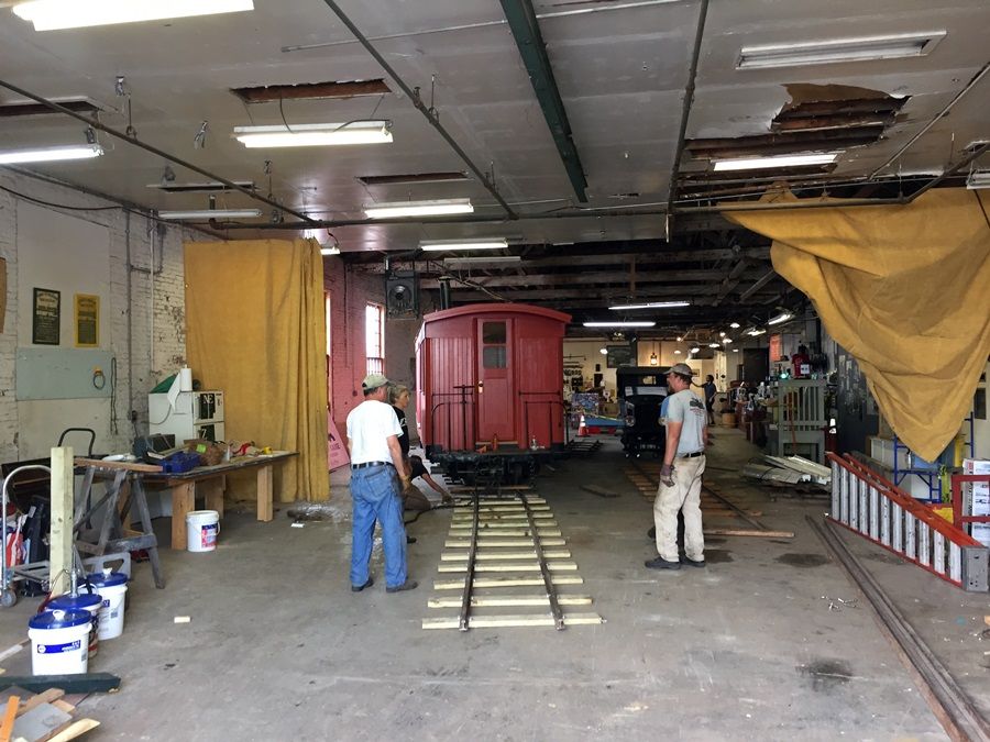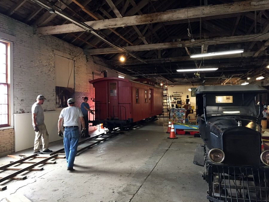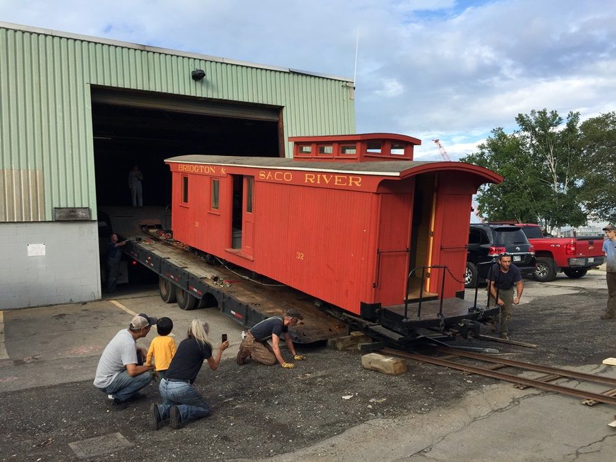 Moving the caboose out of the building and onto the trailer.