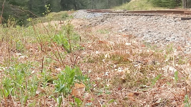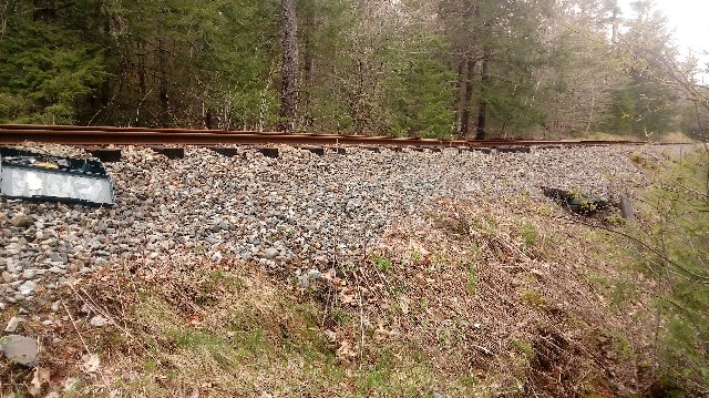 Looking at the track. The timbers running up the bank are from an old make shift set of stairs an abutter had built for a trail to go up the bank. The trail followed the tracks from here north to Humason Trestle, where it went to the west just prior to the trestle. The timbers above them are from a failed retaining wall, which is what started this whole project to begin with..
