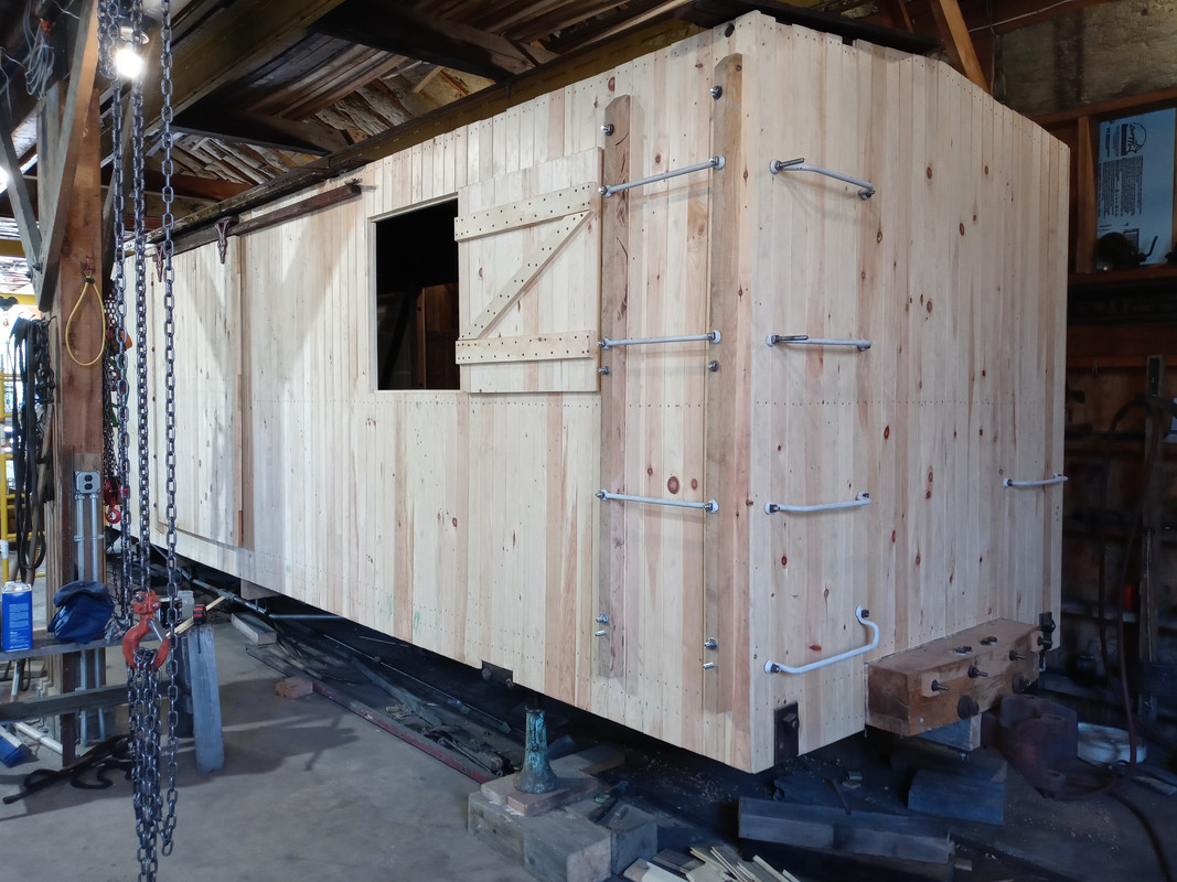 A view of the sheathed boxcar on the left in shop bay 3, next to coach No. 9 in shop bay 2.