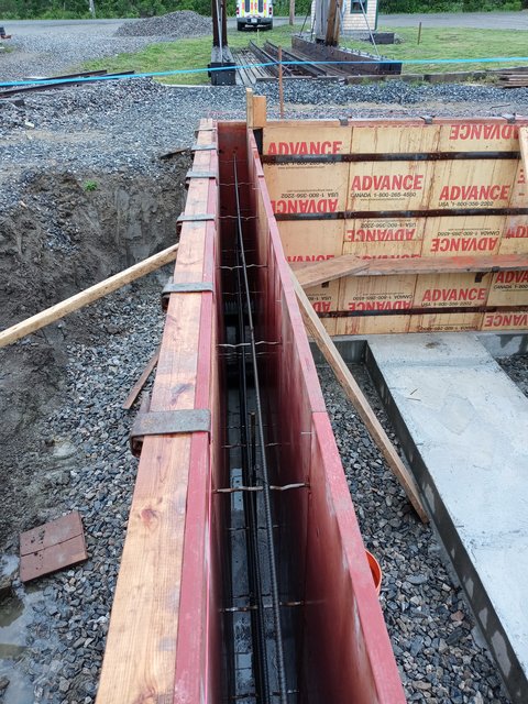 Front wall. Stop blocks have been installed where the frost wall drops for the door openings.