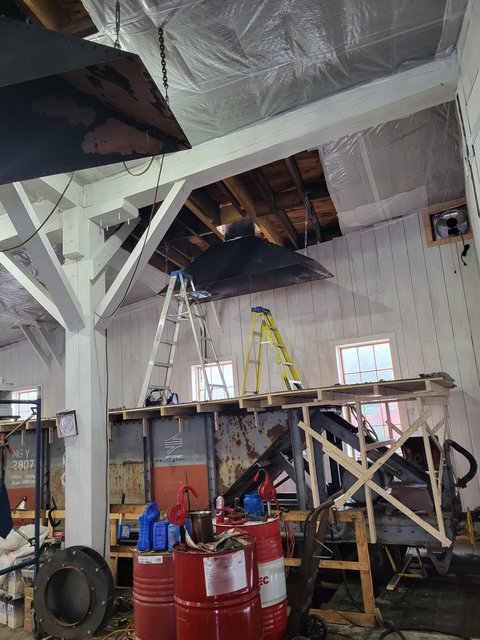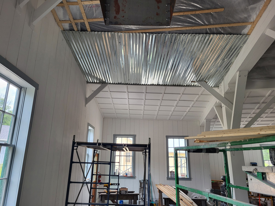 It's a tin ceiling to reduce the risk of fire in the areas above the locomotive boilers. The WW&F lost their Wiscasset engine house (and part of their locomotive fleet) to fire, and we have tried to take measures to ensure that part of our history is never replicated.