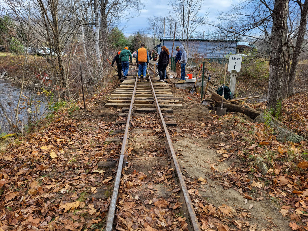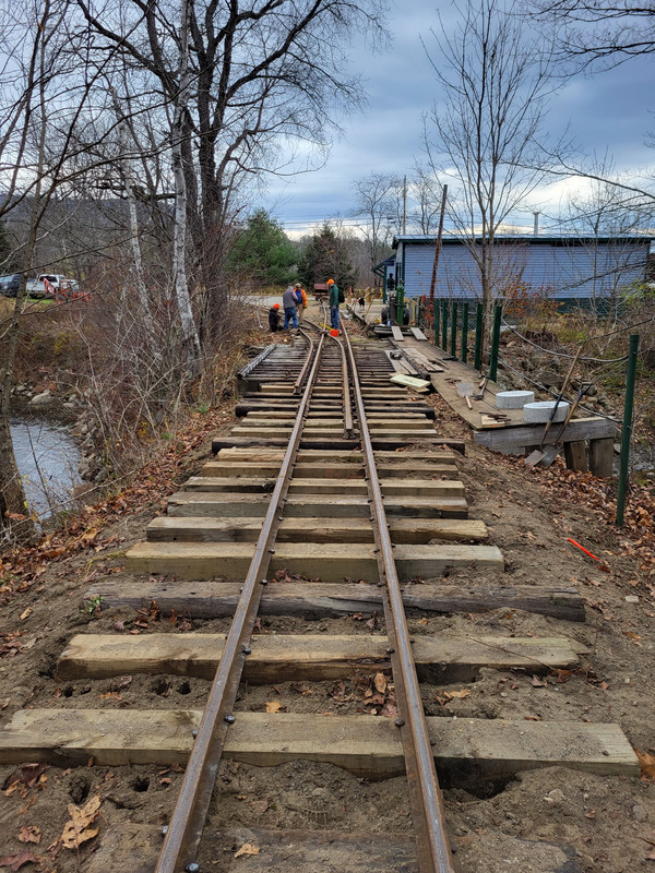 I don't know if anyone took pictures yesterday.  There was about a half dozen of us from the WW&F, and another half dozen or so SR&RL volunteers.  They had torn out a section and a half of track right compass west of the bridge, removed the ties, put in new longer ties, and replaced the rail.  We had to adjust the height of the ballast and spike the track.  They are rebuilding a siding that was there so that they can load/unload cars/engines for road transport.  A group worked on getting the ramp built, while another group worked building the track from the frog across the bridge (as a gauntlet track); the "switch" will be done as a stub switch to be moved as needed when the road moves happen.  Fred, JB and I came up together and left about 2:30, people were still going strong when we left.