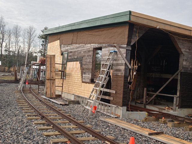 Rocks are being stockpiled to use along the main line between the station and pump house. The bank keeps slumping causing the track to lean.