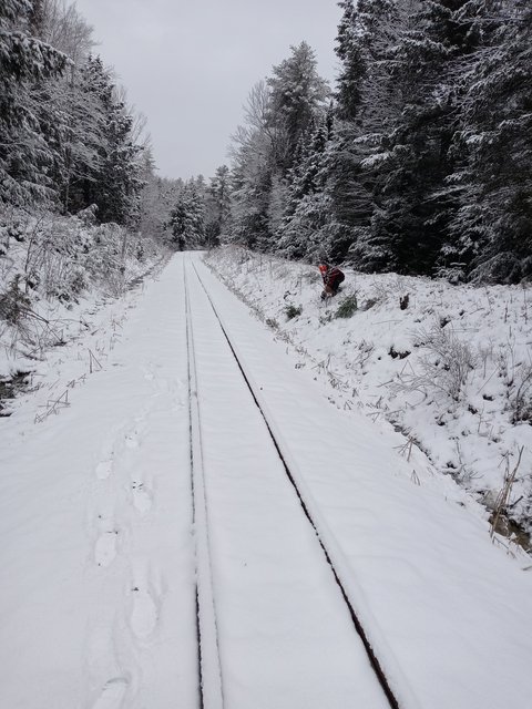 The morning focused on the lower portion of Davis grade.  We're looking south, toward Sheepscot.  Brush has been cleared from the east side of the right-of-way, a big improvement.  Work is underway on the west side.  The sapling across the track in the foreground is an example of some of the brush cleared today.
