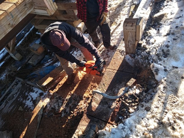 Pictures are not clear enough to show, but Brian is cutting the joists after they supported the building on blocking.