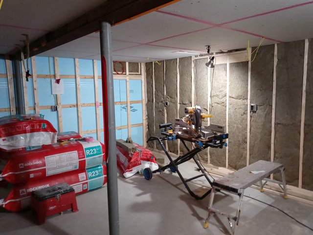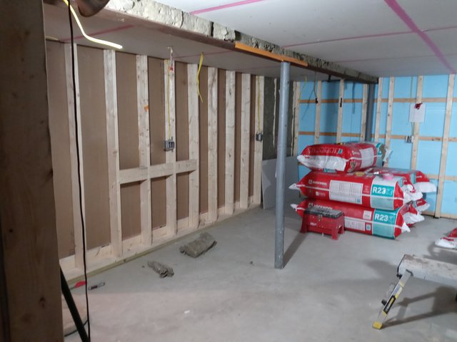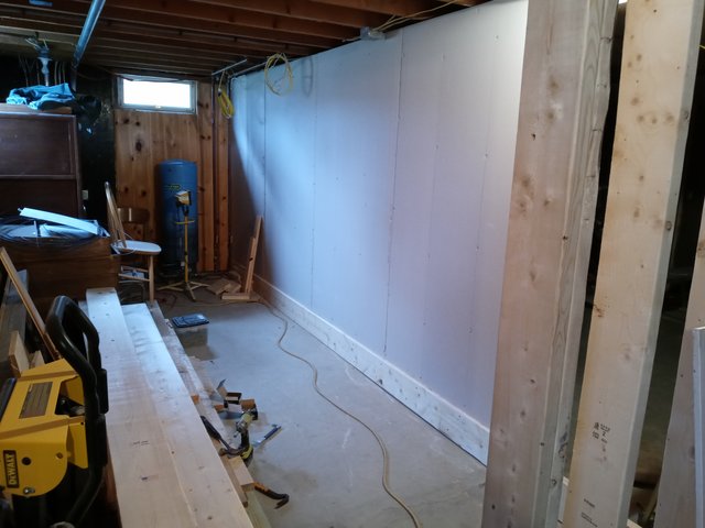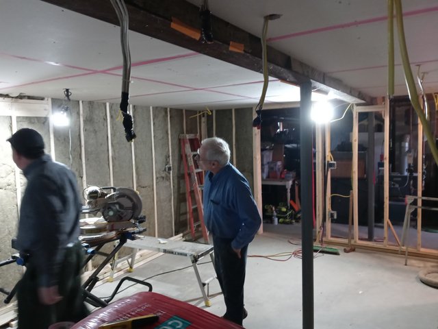 For those wondering about the hanging wires, there were junction boxes on the floor joists above the basement. The boxes were removed before the room construction got to cover over the joists, and the boxes will be reinstalled when our electrician revisits us. Meanwhile they are taped off.