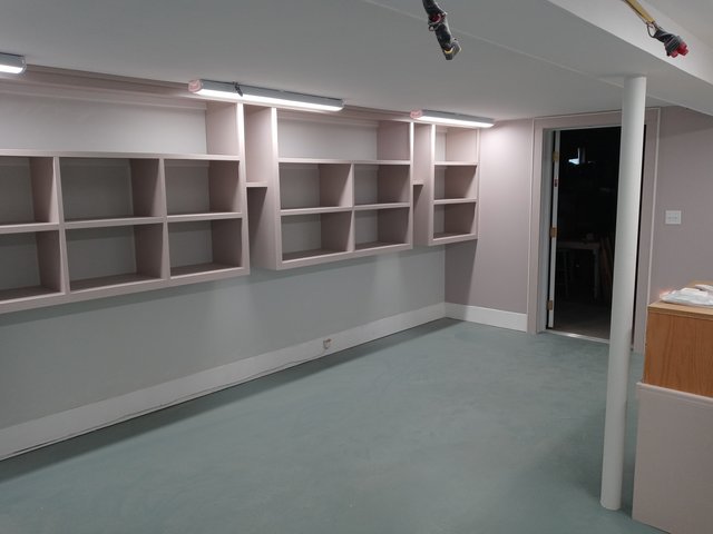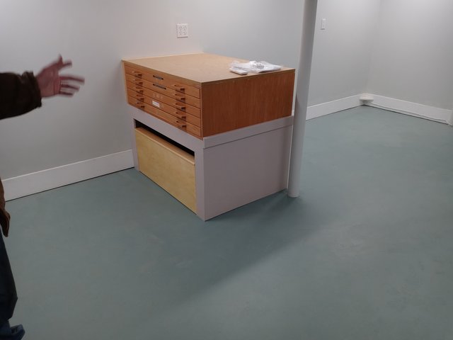 Linda moved in yesterday, with tables and shelving, and moved down some archival boxes from upstairs. She's being very deliberate and thoughtful about what goes in, as the archives will sharing space with gift shop storage when that moves into the basement while the gift shop building is lowered.