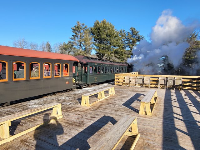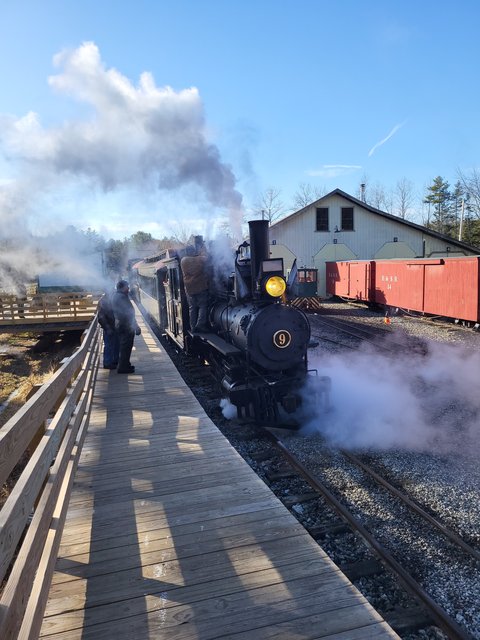 A different view of No. 9 getting serviced in her usual spot at Sheepscot, courtesy of the new passenger platform.