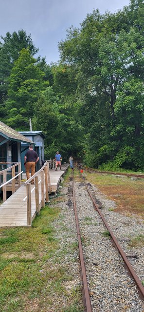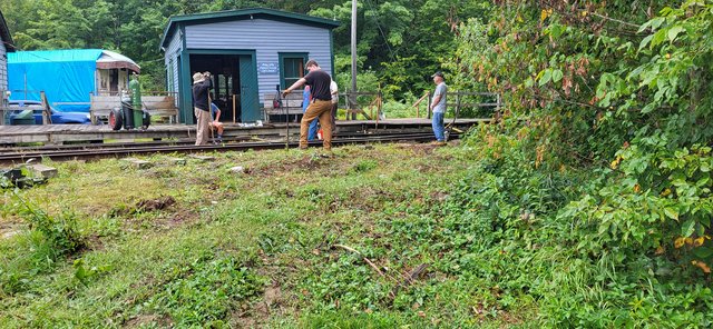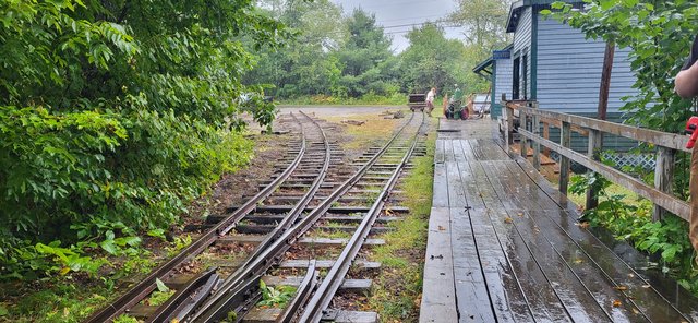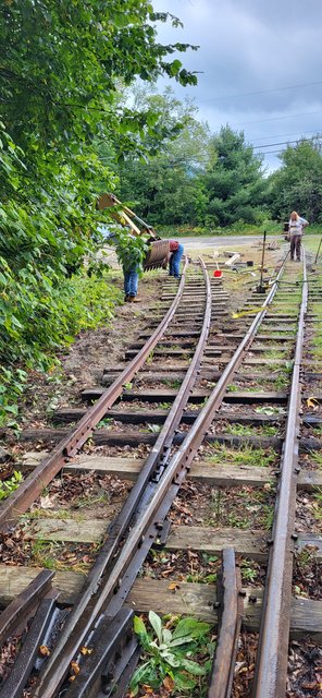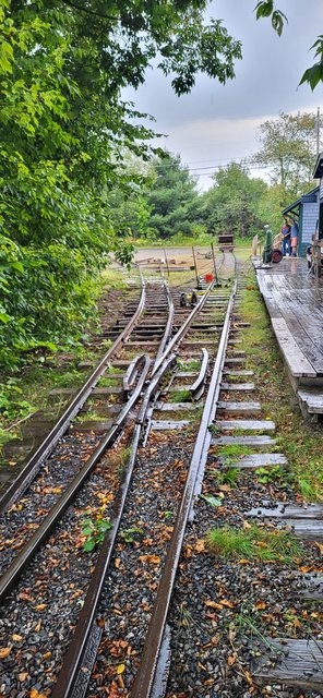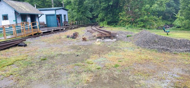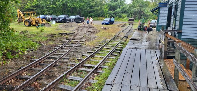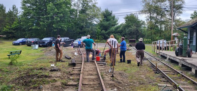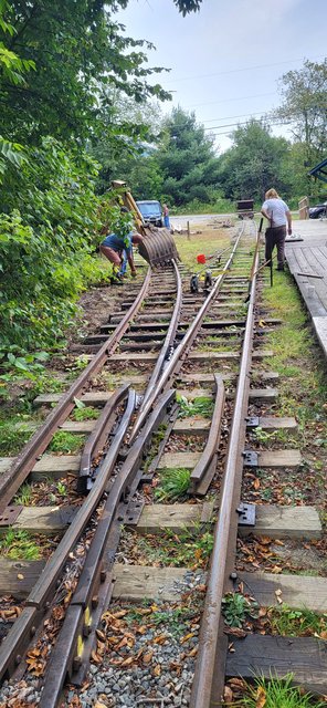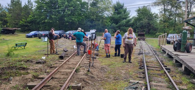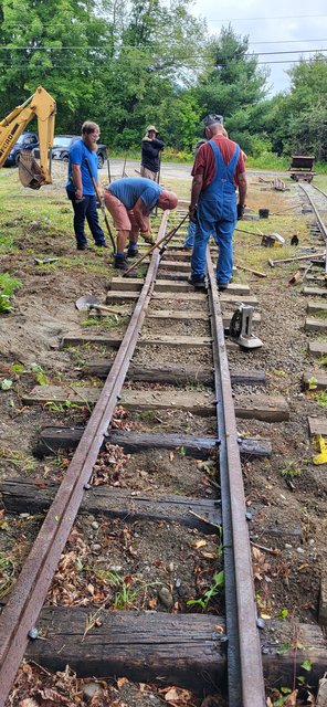 We had a very good day. Four of us from the WW&F assisted several members of the SR&RL work on their ramp track. This is the same track that we started work on 2 years ago with Fred encouraging us along. The ramp portion is now spiked and mostly lined. Sharon is very pleased. From the WW&F it was myself, Luke B, Daniel Mo., and Fred C. The Sandy River volunteers included Sharon B., Guy R, and Leza G., who also provided a great lunch, with other volunteers Charlie K, Rick B., Emmet L., Jeb B., John S. and some youngsters that helped a little were Sophia (Jebs daughter) Emmaline and Callum B. (Jebs neice and nephew). We got rained on a couple times but it was short the first time and quitting time the last..