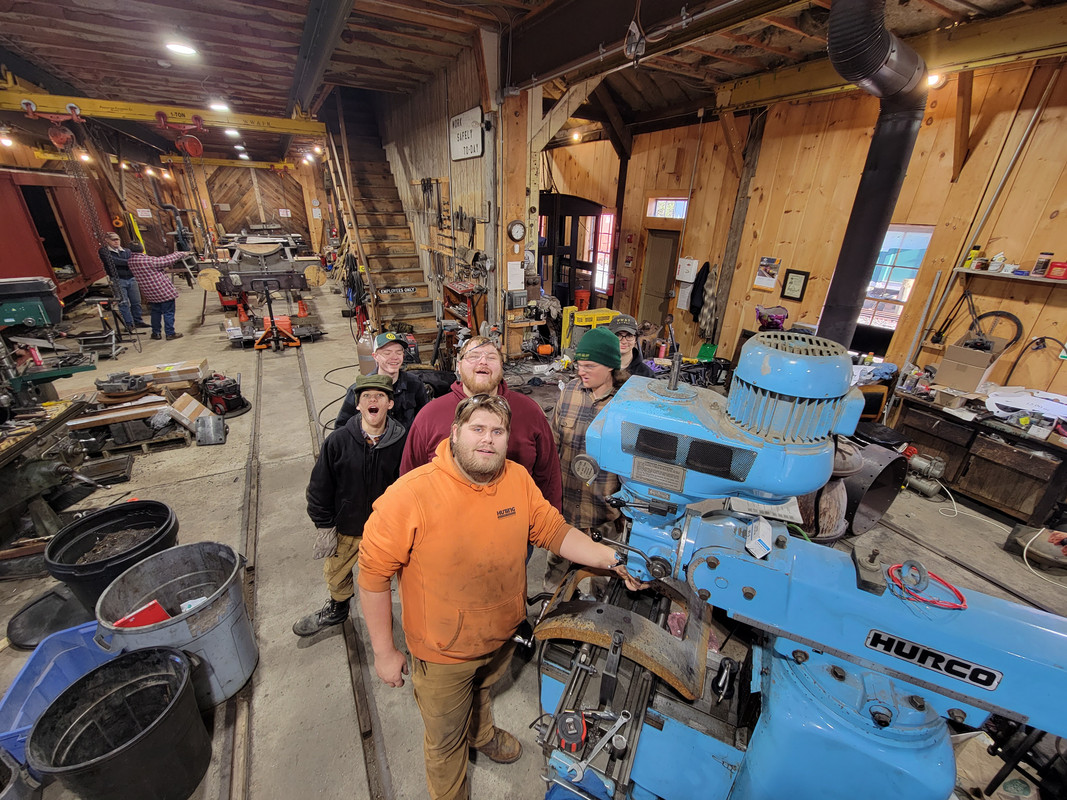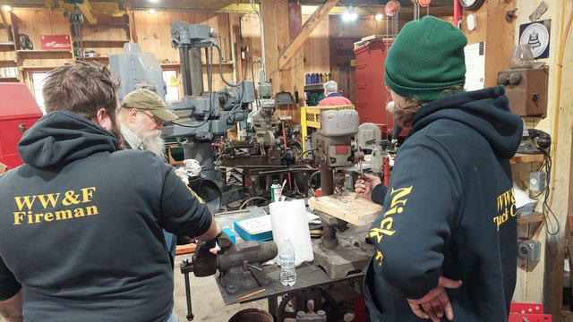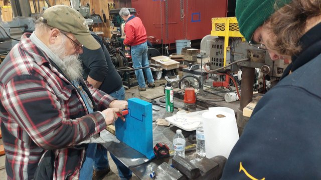 Early on, a portion of the crew reviewing the smoke box cylinder saddle.