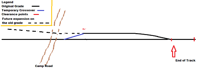 By way of reference to Ken Flemming's "keep it simple" comment, this would eliminate paying for, building, and ultimately removing one or two superfluous switches, would allow accurate restoration of TOM siding including keeping the mainline switch at its original location, and would satisfy both of the critical safety functions mentioned above - which I believe are the essential ones identified in every discussion of this issue.
