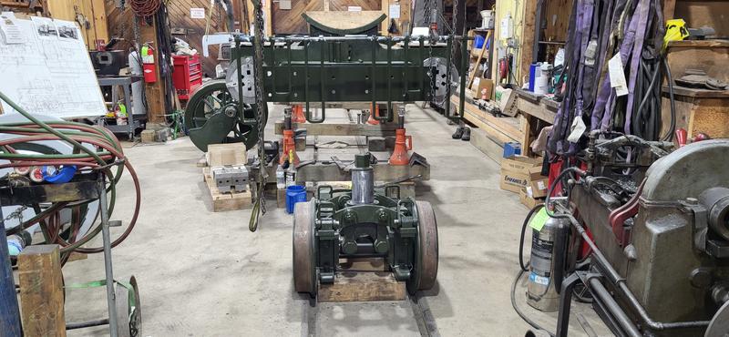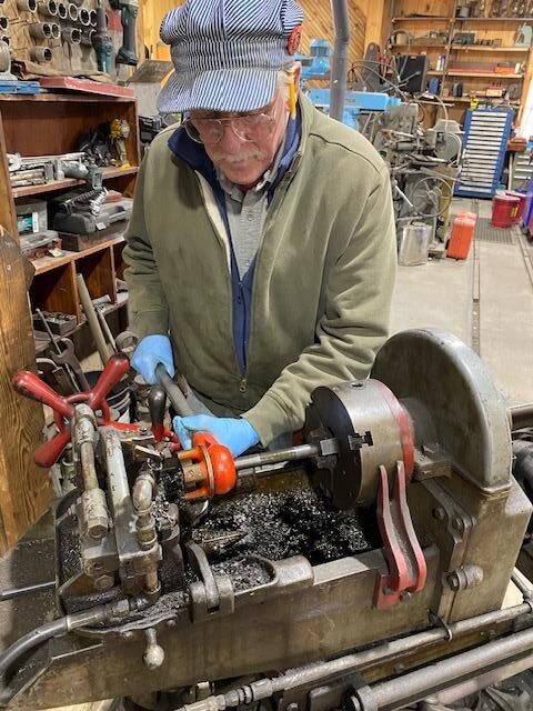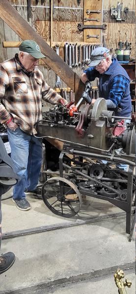 It's an old school threading machine with pump feed for the cutting oil. I'm threading a piece of 3/4 inch rod that will become part of the tumbling spring assembly on No.11. Zack is helping by keeping the oil flowing where needed. This assembly connects to the tumbling shaft and equalizes the weight of the valve gear in order to make operating the reversing/cut-off lever a manageable task.