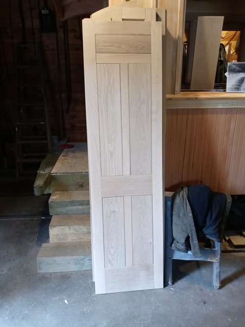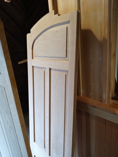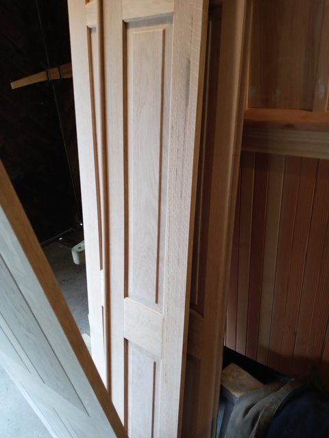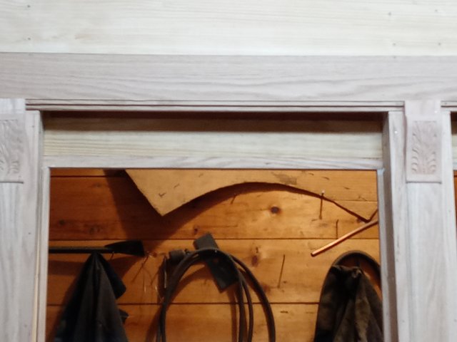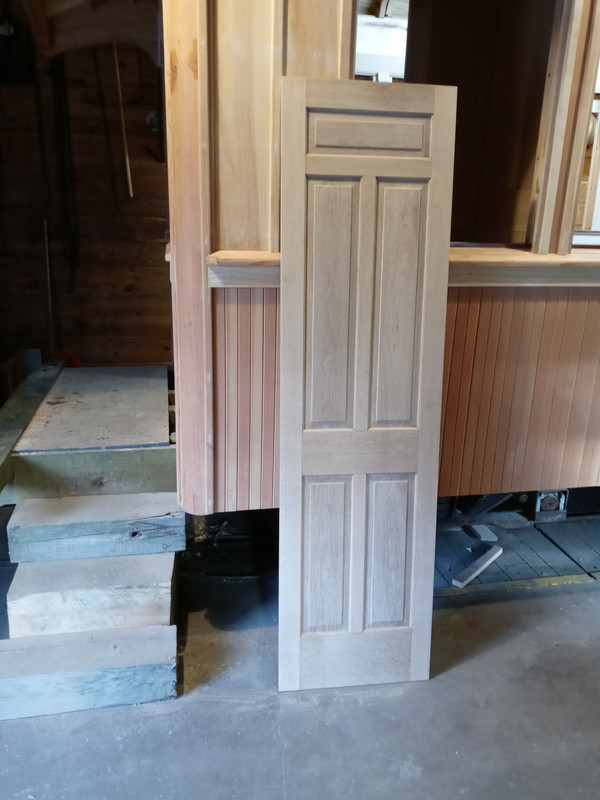 What is not very obvious in these photos is the most recent work. The strip of molding above the windows is now finished and in place- not screwed down, but held in place by its close fit. This was probably the hardest part we have made. It required about a dozen passes through the shaper and 6 or 7 passes over the table saw at an angle to make the relief curve on the backside for the window shade.