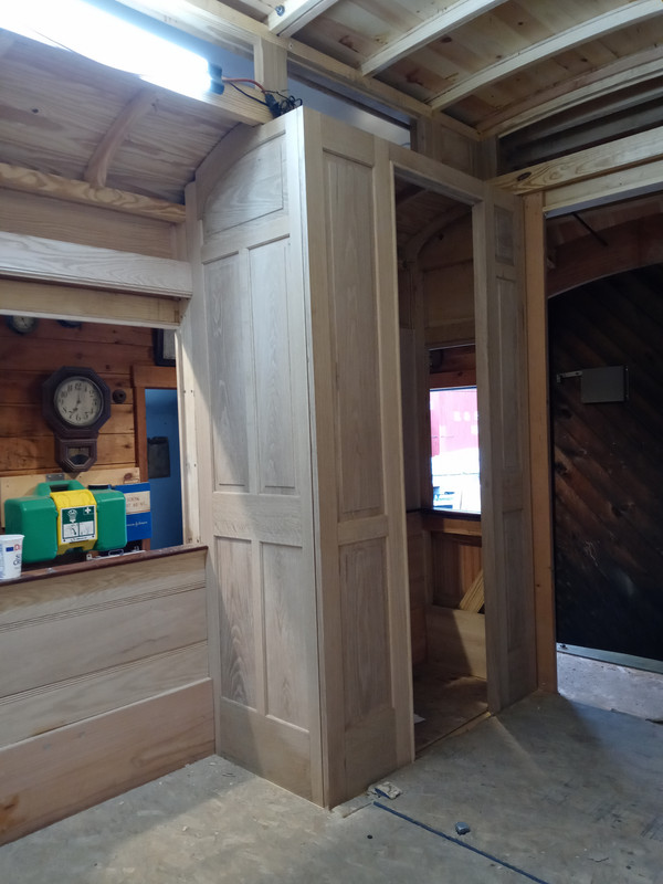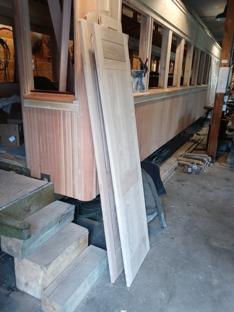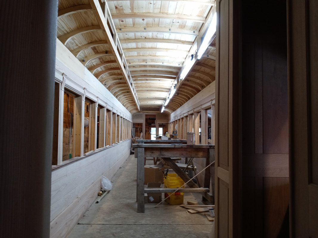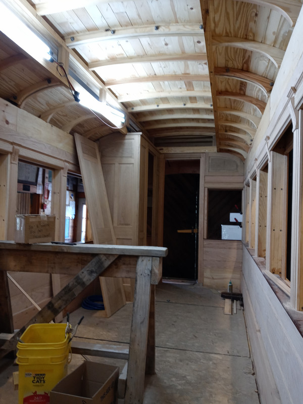 It is interesting to me that all through this project we have faced complicated tasks. As we work toward them Eric and I talk them over while we are doing simpler jobs. By the time we get to the hard part we pretty well have it figured out and it goes well. The next tough job, at least to me, are the ceiling panels. These are thin veneer sheets, curved into the roof curve, and painted with scroll work. I am confident by the time we get there we will have figured this out as well.