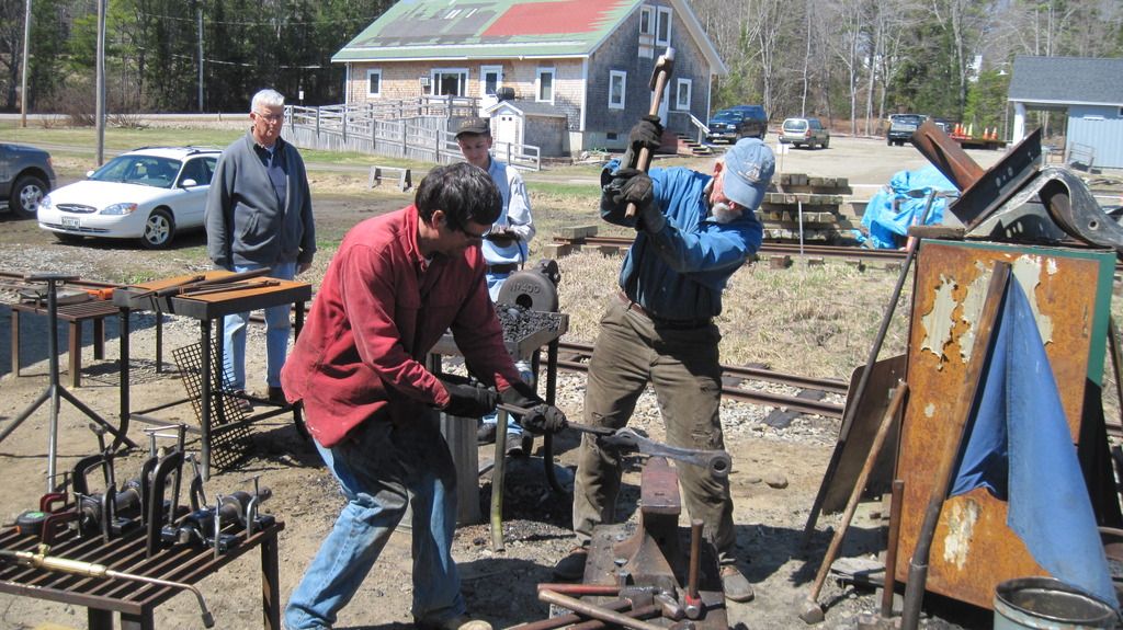 Phil Goodwin (hand on the vise) did the early cranking of the blower to get the fire going in the morning. Now Hansel Fardon is having a go at it. When revved up the blower makes an interesting up-and-down moaning sound. (At least I THINK it was the blower, not a volunteer.) A swing link is buried in the coals, and Eric Schade and J.B. Smith are waiting for it to heat up.