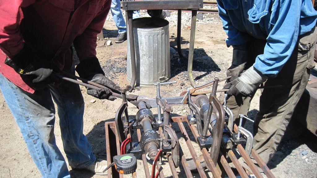 Pins from the truck were carefully positioned and clamped to the grating to form a gauge. Eric and J.B. are preparing to try a swing link on the gauge, and it looks as though they’ll need to do some more forging before that one has the correct length.